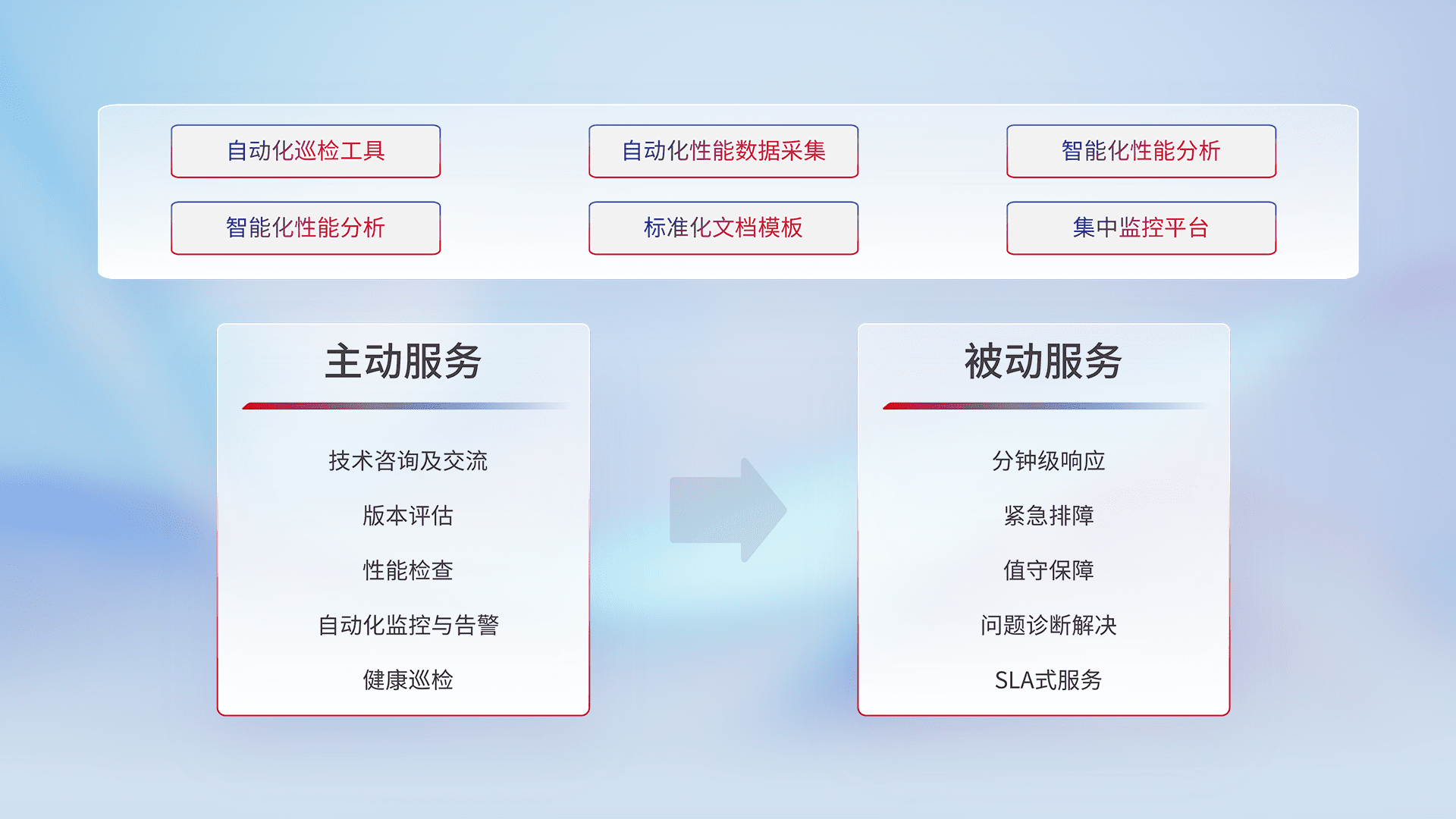 智能化工具和标准化文档,,,保障服务质量,,,提供主动服务(包含技术咨询、、、、版本评估、、、性能检查、、自动化监控与告警、、、健康巡检)和被动服务包含(分钟级响应、、、、紧急排障、、、、值守保障、、问题诊断解决、、、、SLA服务)。。。。